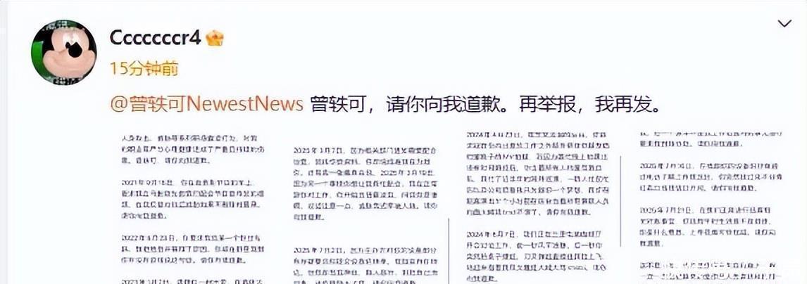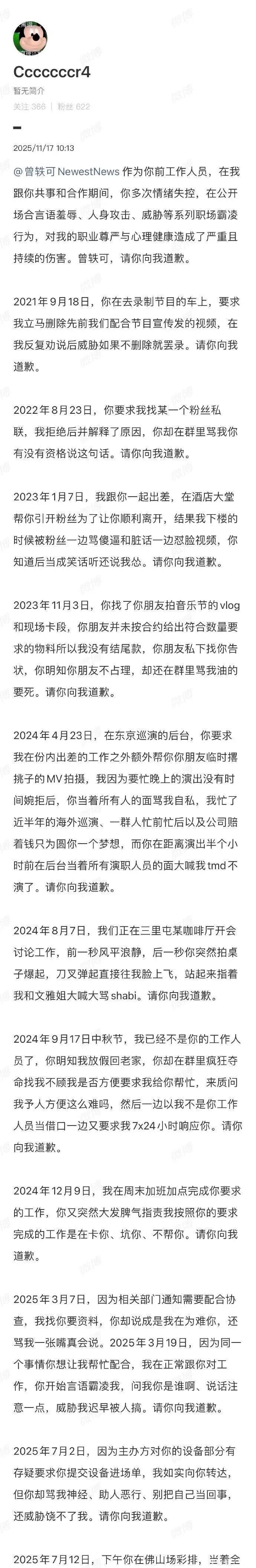 没过多久,这条帖子就从社交平台上不见了。就在大家以为事情就此过去的时候,11 月 17 日一大早,这位前员工又发了新帖子,语气很坚决:“曾轶可,你必须得道歉!你再举报,我就再发!”