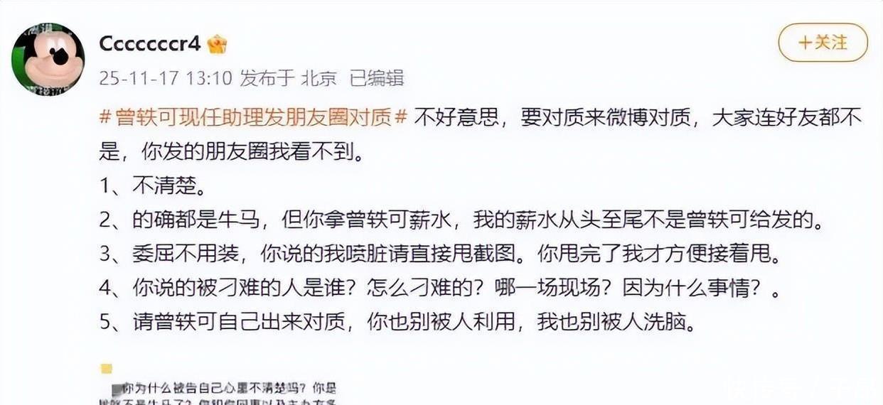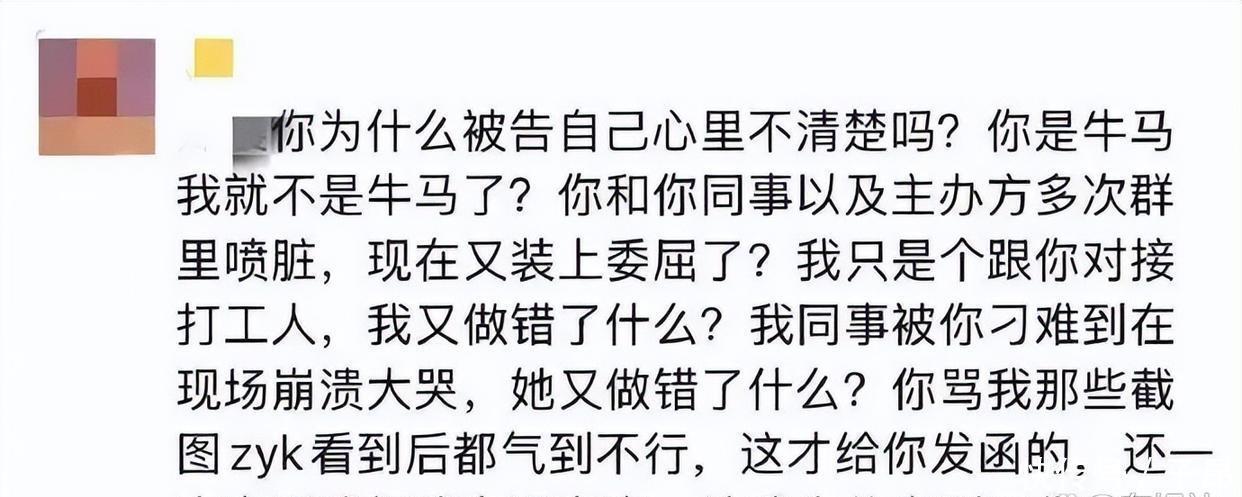 刚刚硬气表态完,曾轶可的现任助理立马在朋友圈里回了一句,回应得挺直接的。她挺委屈地说:你为什么被公司追责,自己都不清楚啊?咱们都是打工的,凭啥找我麻烦?你在群里跟同事、主办方说脏话的时候怎么不表现出委屈呢?我同事被你刁难到当场哭,她到底做错了什么?曾轶可看到你骂我的截图都气坏了,才发了个函提醒你,还一直劝我别太难过、好好休息。之前她还说你不是坏人,只是被洗脑了。