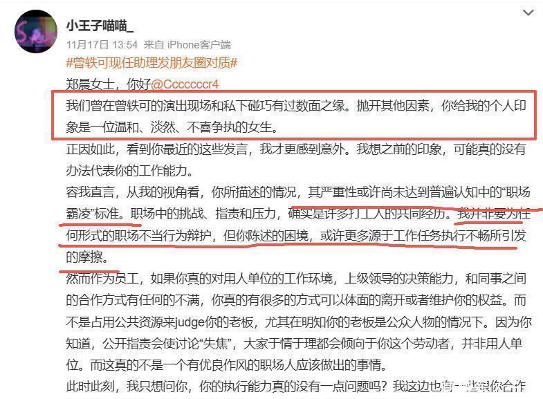 到这里,曾轶可的职场霸凌基本可以算是真实案例了。前员工留存聊天记录作为证据,而当下的助理只敢嘴上抱怨,没有拿出反驳的凭据,曾轶可自己也一直没有正面回应或露面。