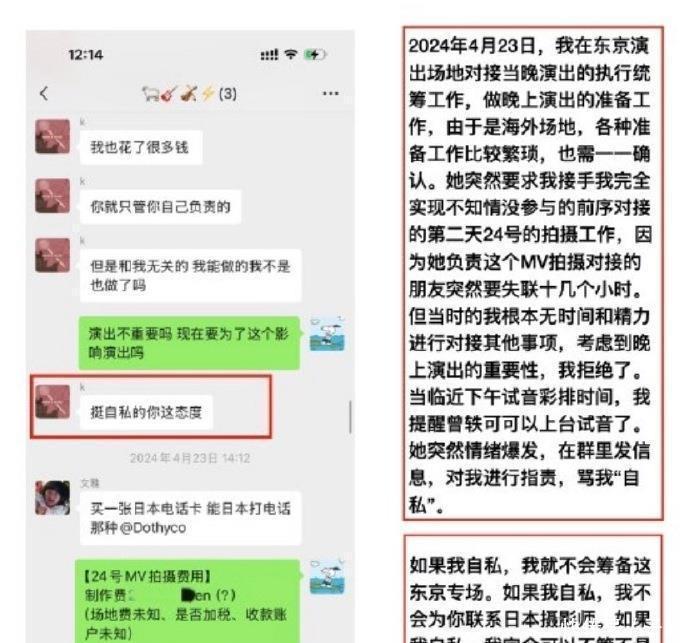 还没等现任助理拿出证据,前员工就先爆料,公布了一条实锤——2024年曾轶可在东京演出后台的聊天记录。记录里说,曾轶可现场跟工作人员较劲,还情绪激动地大喊“他妈的我不演了”,快上台之前就闹脾气,把团队都弄得焦头烂额。