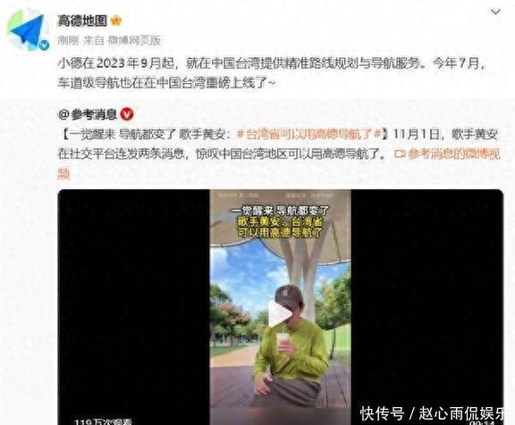 可把大家伙儿给盼坏了!这一天总算来啦!11月1号那天,咱们熟悉的台湾歌手黄安,在微博上连着发了两条动态,那叫一个激动,跟发现新大陆似的:说现在台湾省能用高德地图导航了。